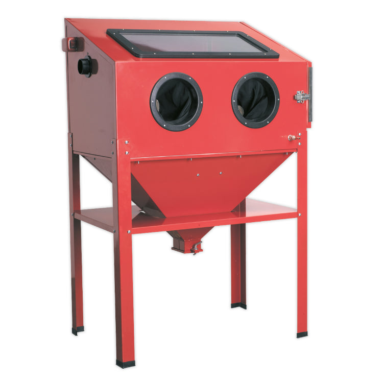 Heavy-duty steel cabinet, toughened glass viewing screen and integral low voltage illumination. Includes dust extraction port. Cabinet is supplied, heavy gauntlets, sand blasting gun, four ceramic nozzles and a pack of screen covers. Suitable for glass beads, silicone carbide, aluminium oxide and shot blasting grit only.