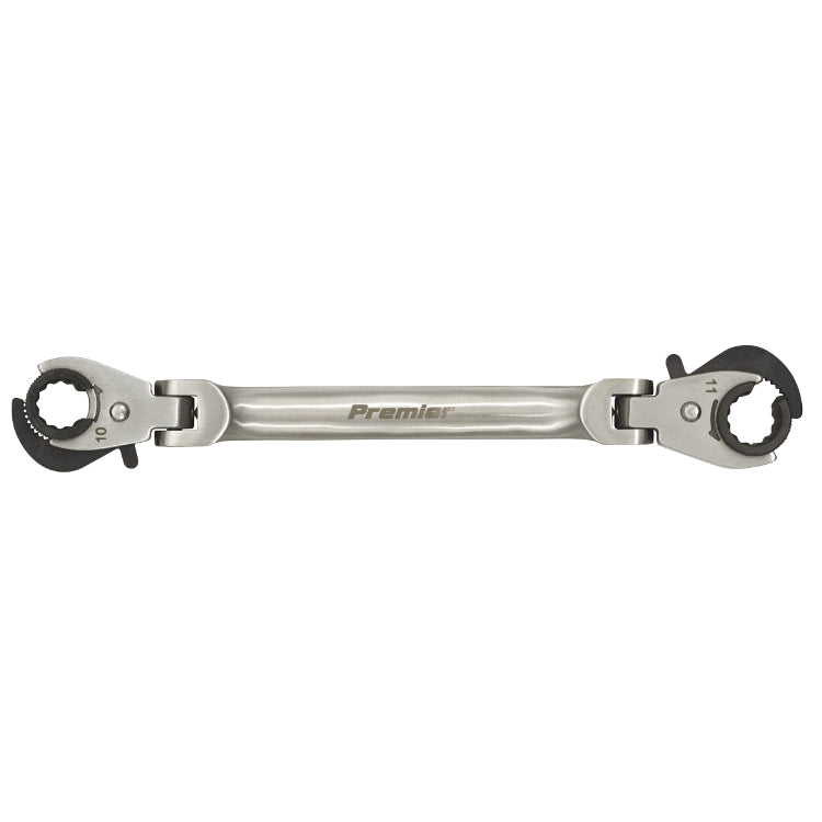 Manufactured from high quality stainless steel, a fully polished satin finish.Features double end 72-tooth ultra-smooth ratchet, flexi-head for limited access applications.Ideal for most brake pipe fittings.*Lifetime guarantee*