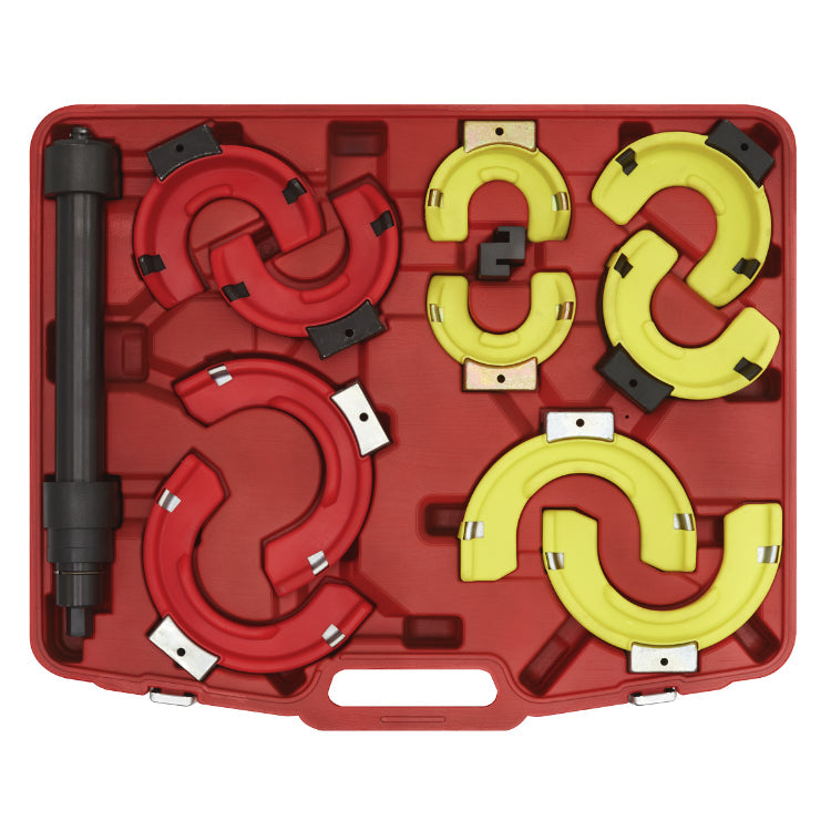 Suitable for MacPherson strut coil springs. Supplied, five pairs of different sized interchangeable yokes, for right and left-handed coil springs. Plastic yoke protectors that protect the spring coating from damage, which can invalidate the vehicle manufacturer's guarantee. Safety yokes carefully shaped to stop the spring bowing while under compression.