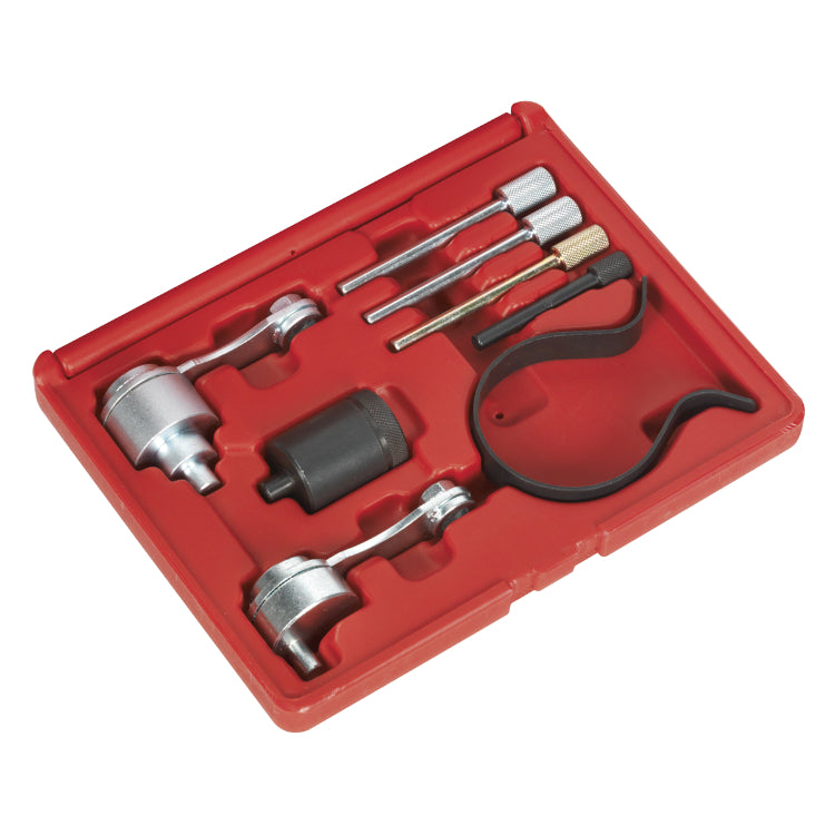 Kit contains camshaft locking and checking pins, flywheel locking tools, coolant pump pin and belt retaining clip.