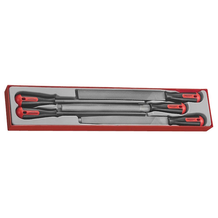 5-piece hand file set with ergonomic thermoplastic rubber (TPR) anti-slip grips for filing flat surfaces, sharp corners and shoulders as well as for deburring. Second-cut cross-teeth remove material quickly while leaving a smooth finish.