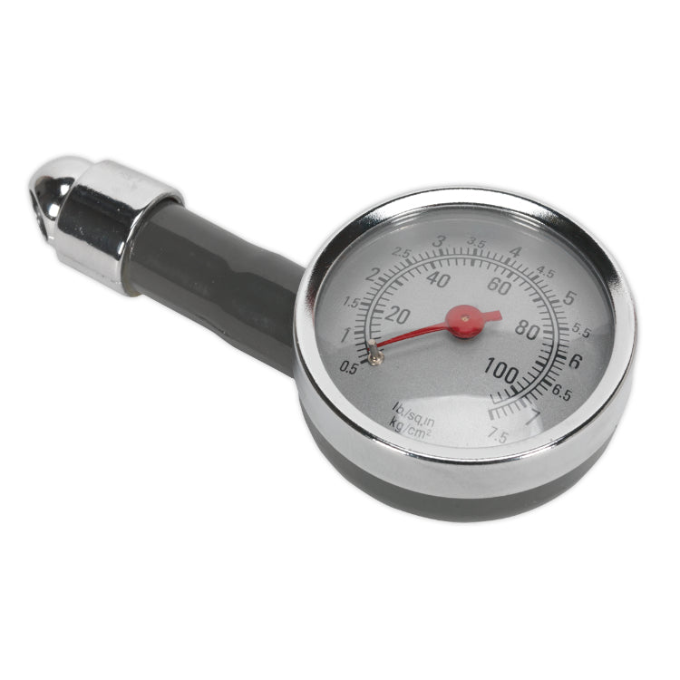 Pressure gauge, 46mm dial, reading up to 100psi(7kg/cm²).Metal body and offset valve connector.Compatible, both cars and light commercial vehicles.Warranty: 1 year