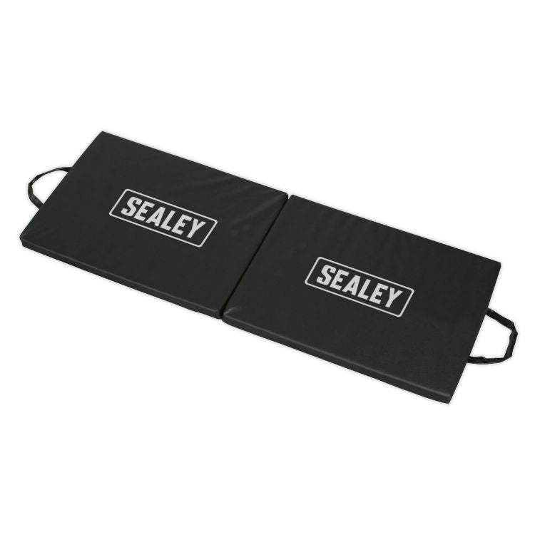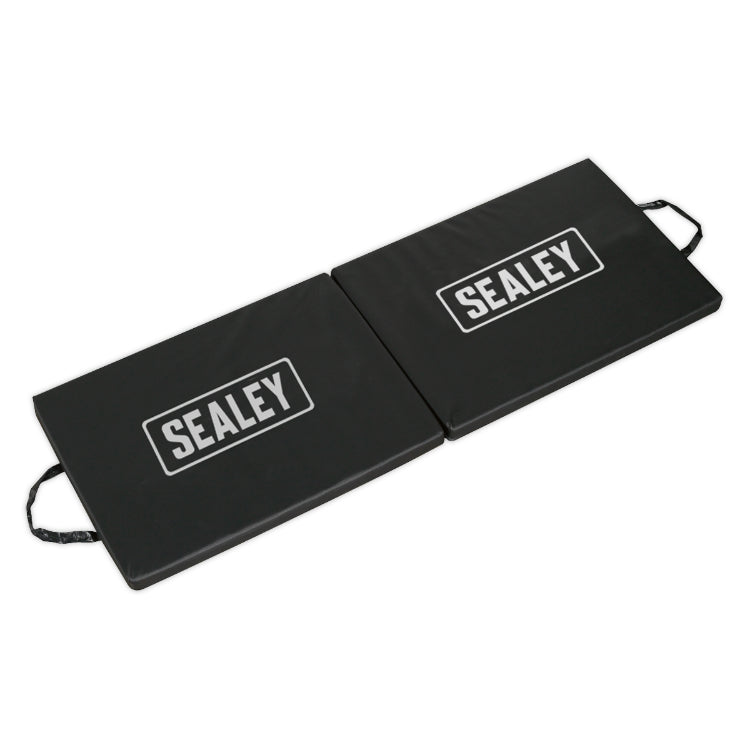 Flexible work mat, two handles for portability. Durable composite cover that resists stains and fluids. High-density padding for added comfort. Ideal for working on cold garage floors and for roadside repairs. Open Size (L x W x D): 1220 x 444 x 38mm.
