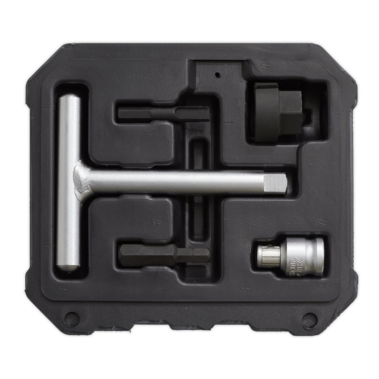 Designed for use, BMW, Ford and PSA plastic drain bungs, as fitted to modern engine ranges.Contains T-Drive, slotted socket, adaptor, hex key and drive bit.