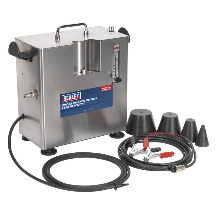 Uses mineral oil and workshop air to generate smoke at low pressure while connected to a vehicle.