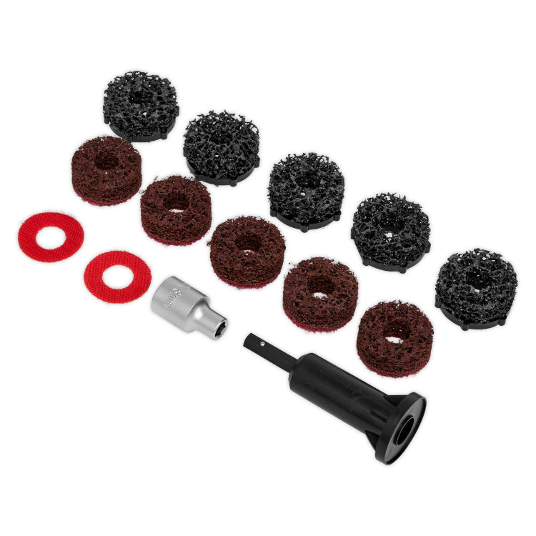 Removes surface dirt and corrosion on hubs fitted, studs. Ideal for preparing wheels, hubs and brake discs or drums for re-assembly. Cleaning discs fit over wheel studs. Use, power drill or air impact wrench. Supplied, 1/2"Sq drive adaptor. Replacement cleaning pads available, order Model No. VS8002A.