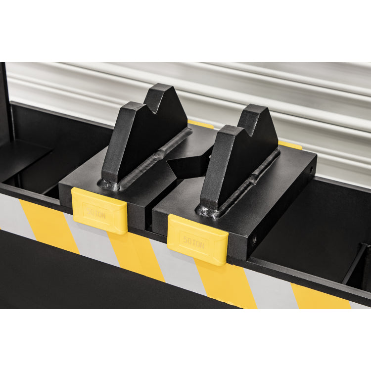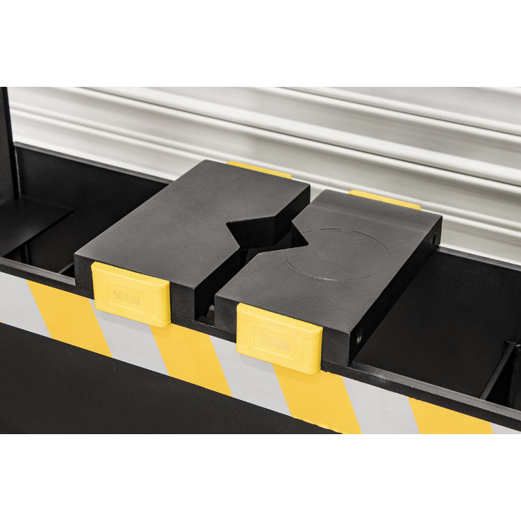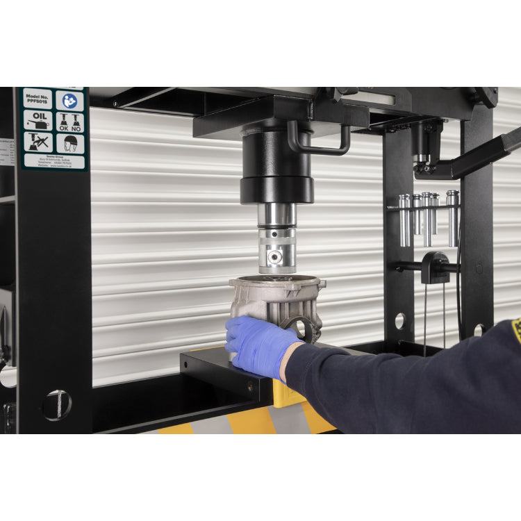 Sliding hydraulic ram assembly giving 280mm of lateral travel for off-centre pressing applications.