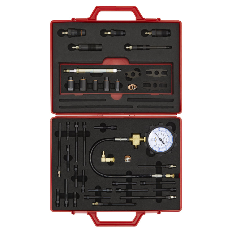 Large, 70mm, 70bar(1000psi) gauge, rubber bumper, straight and right angled quick connect fittings and an extensive range of glow plug and injector adaptors.