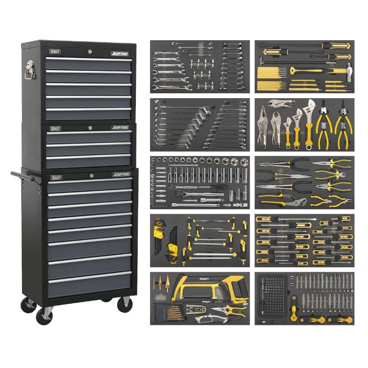Sealey Toolchest Combination 16 Drawer Ball-Bearing Slides - Black/Grey & 420pc Tool Kit (Siegen)