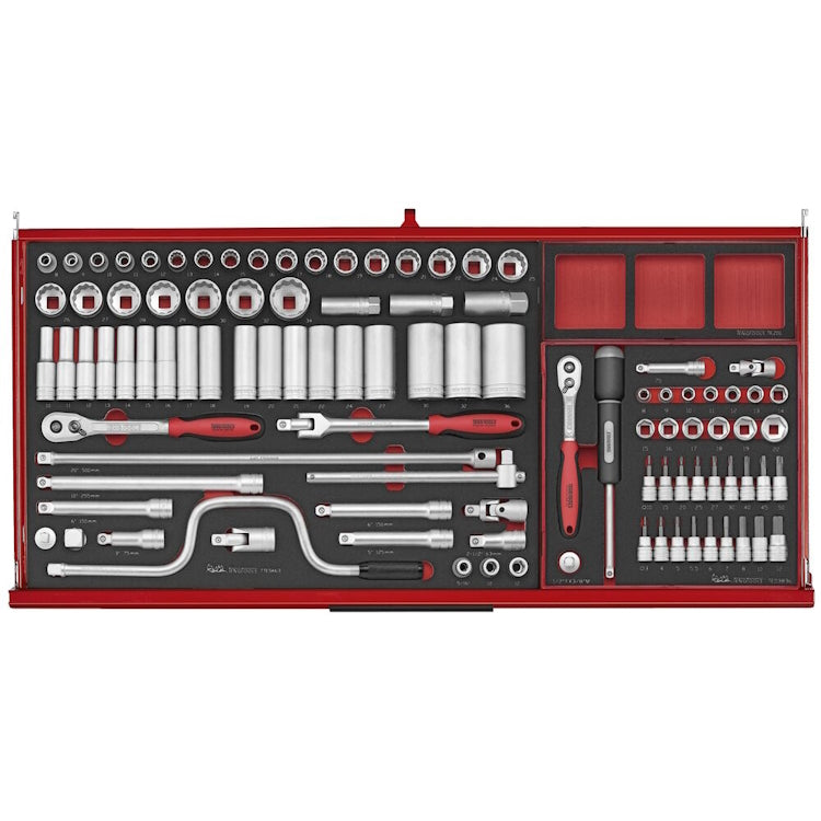 The Teng Tools 37" PRO35 tool kit TKW37R513F in matte red is a robust 513-piece tool set designed for mechanics in the automotive industry and other demanding mechanical fields. The chassis of the roller cabinet features a 3-piece construction made of heavy-duty steel and has undergone a 5-step phosphate-free rust protection process for enhanced longevity and corrosion resistance. The overall dimensions of the roller cabinet are 964mm in width, 460mm in depth and 985mm in height with the castors mounted, providing ample storage space for a variety of tools while maintaining a manageable size that does not take up too much space in the workarea. It has two 2" wide heavy-duty castors, two 5" braked swivel castors and two 5" fixed castors. A comfort grip handle on the side makes it easy to move and the sides feature holes for accessories that can be used to customize the tool storage to specific needs. The roller cabinet has seven fully extendable drawers, five of which are 75mm high and two larger drawers that are 154mm high for bulky tools. The five smaller drawers have a load capacity of up to 25kg each, while the larger drawers have a load capacity of up to 40kg. The drawers are equipped with smooth-running ball-bearing slides and noise-reducing EVA mats. A user-friendly 3-digit combination lock secures all drawers simultaneously, eliminating the issue of handling keys that can be lost or copied. The tools include a wide selection of hand tools designed for heavy vehicle maintenance such as various drive sockets, bit sockets, ratchets, impact tools, combination spanners, screwdrivers, hex keys, T-handle TX keys, pliers, power grip pliers and chisels. Each individual tool set is systematically organized in precision cut tri-colour EVA foam modules for easy identification of missing or misplaced tools. The tool kit includes a 5mm thick EVA mat intended for the tool cart's work surface, five TEZ01 EVA modules with three compartments each for organizing smaller items and a practical paper roll holder.