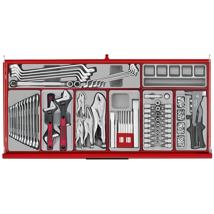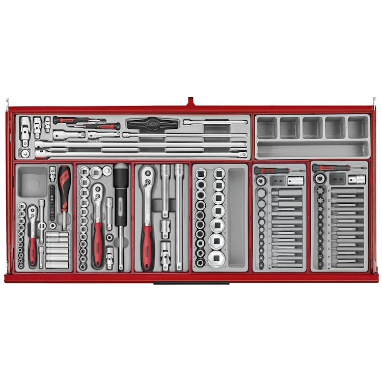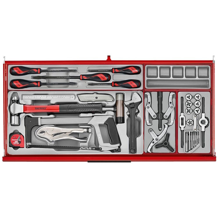The Teng Tools 37" PRO35 tool kit TKW37R595T in matte red roller cabinet is a 595-piece assortment compiled for professionals in the automotive and heavy-duty vehicle sectors, enabling an extensive variety of mechanical operations. Each toolset is methodically placed in a dedicated module compatible with the Teng Tools Tool Control System for easy identification of missing or misplaced tools. The roller cabinet measures 964mm in width, 460mm in depth and 985mm in height with castors. This compact design provides generous storage to suit professional environments. It has a durable 3-piece heavy gauge steel chassis and has undergone a 5-step phosphate-free rust prevention process to ensure corrosion resistance. It features seven fully extendable drawers – five with a height of 75mm and two taller drawers at 154mm. Each drawer supports up to 25kg while the larger drawers can hold up to 40kg. All drawers are fitted with ball bearing slides as well as noise reducing and protective EVA mats. A 3-digit combination lock secures all the drawers at once, removing the hassle of managing keys that can easily be lost or duplicated. The tools are selected for automotive work: 1/4", 3/8", 1/2" and 3/4" drive sockets, bit sockets, ratchets, impact tools, combination spanners, screwdrivers, bits, T-handle hex & tx keys, pliers, power grips, torque wrenches, taps, dies, pullers, pry bars, files, hammers and general tools. It has 2" wide heavy-duty castors, including two 5" braked swivel castors and two 5" fixed castors and a comfort grip handle on the side that aids in maneuvering. It includes an 18mm laminated MDF work surface, a shelf that fits at the bottom of the side of the roller cabinet for storing longer items and six TTZ01 modules with three compartments each for storing small parts and accessories.