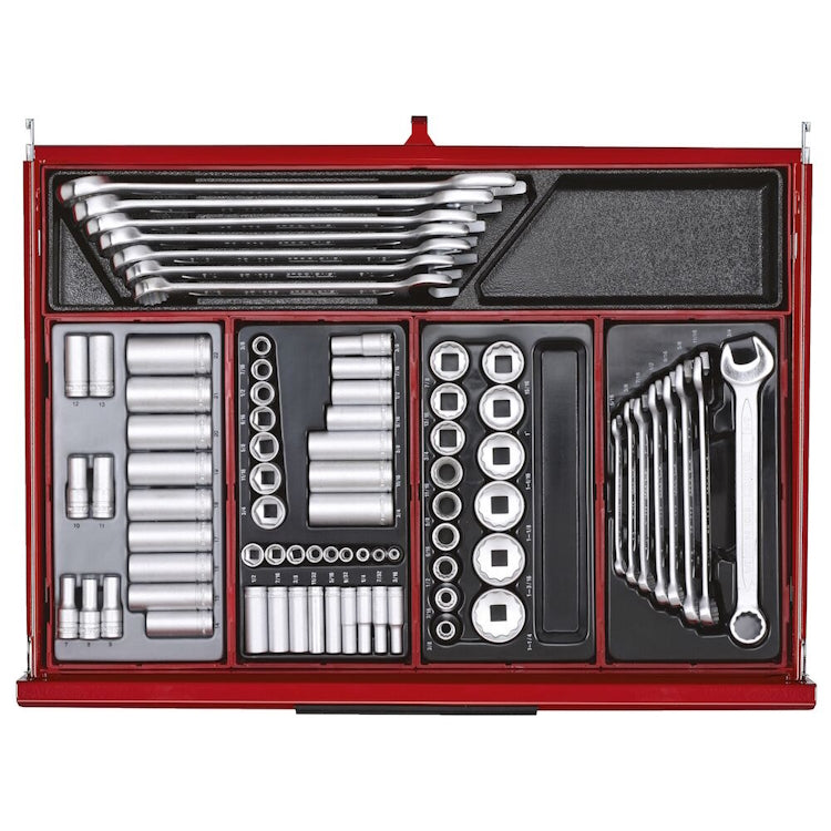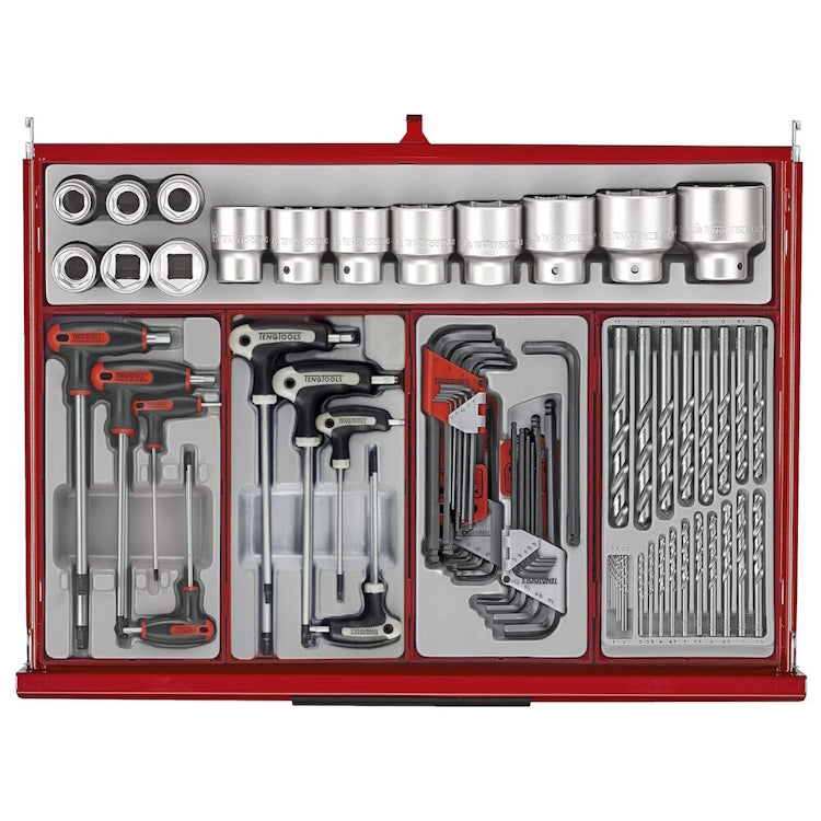 The Teng Tools 53" PRO35 roller cabinet tool kit TKW53R615T in matte red is crafted to fulfill the needs of industry professionals. The toolkit includes 615 durable pieces with a variety that makes it an asset in a wide range of industrial environments. The core component of the tool kit is the TSW53R9 roller cabinet, which measures 1350mm in width, 460mm in depth and 813mm in height, extending to 983mm with castors. Its nine fully extendable drawers provides ample storage space. Six of the drawers are 75mm high, two drawers are 154mm high and the larger top drawer has a height of 160mm for larger items. Each drawer can support up to 40kg. The tool kit is equipped with a diverse array of tools essential for industrial work, including 1/4, 3/8, 1/2 and 3/4 drive sockets, bit sockets, ratchets, impact tools, combination spanners, screwdrivers, bits, T-handle hex & tx keys, pliers, inch spanners, inch sockets, pullers and other general tools. These tools are meticulously organized in dedicated modules as part of the Teng Tools Tool Control System, ensuring an orderly workspace and facilitating the quick identification of any missing or left-behind tools. The 3-piece heavy gauge steel frame construction of the cabinet guarantees its ability to withstand the rigors of industrial use. It is further reinforced with a 5-step phosphate-free rust prevention process. Each drawer is fitted with ball bearing slides and is lined with an EVA mat to protect the tools and reduce noise. For easy movement and stability, the roller cabinet has been fitted with four heavy-duty 6" swivel castors, two of which are braked. A 3-digit combination lock makes it harder for unauthorised people to gain access to the tools inside. The roller cabinet has holes on both sides for mounting accessories, providing increased customisation options. A paper holder (TCA08) is included in the tool kit, as well as an 18mm thick laminate MDF worktop that provides a durable and practical work surface.