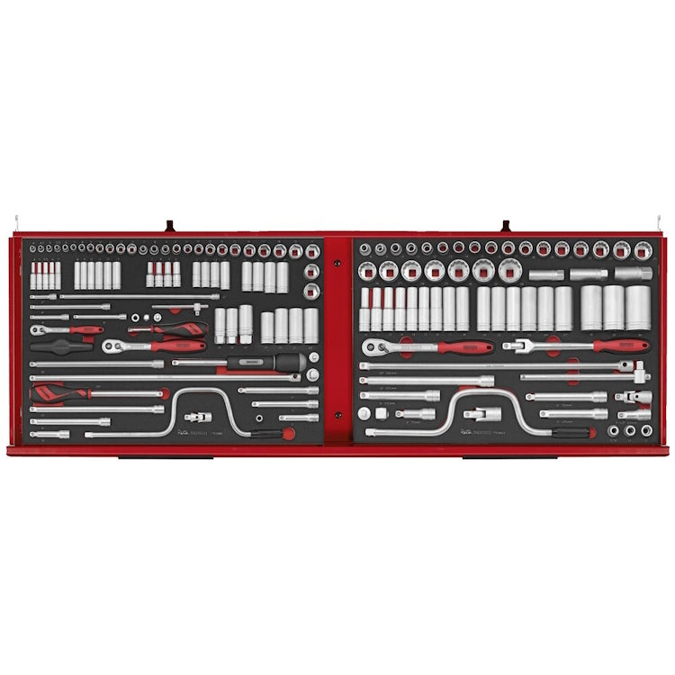 The Teng Tools 53" PRO35 'Monster' FOAM tool kit TKS53R1133F in matte red is a comprehensive 1133-piece tool kit measuring 1350mm wide, 460mm deep and 1543mm high when the castors are fitted. The stacked storage unit offers comprehensive storage and consists of a TSW53R9 roller cabinet and a TST53R10F tool chest, which together have 19 fully extendable drawers in total. The TSW53R9 roller cabinet has six 75mm high drawers, two 154mm drawers and a 160mm top drawer. Each drawer supports up to 40kg. The roller cabinet is complemented by the TST53R10F tool chest with ten drawers, all with a height of 75mm and a load capacity of up to 40kg. The tool kit features a comprehensive set of tools organised in precision-cut modules of 3-colour high-density EVA foam, facilitating quick identification of missing or misplaced tools. This collection includes a variety of socket and spanner sets, spark plug sockets, impact socket and bits, wheel tools, general tool assortments, measuring instruments, flex wrenches, a rivet gun, pliers, punches, chisels, torque tools, bit and nut drivers, pry bars, T-handles, screwdrivers, extension bars, insulated tools, adjustable wrenches and more. A practical holder for paper rolls (TCA08) is also included. The toolkit caters to the demanding needs of professionals in various industries and is compiled to ensure that every task, from the most intricate to the heavy-duty, can be approached with confidence. The roller cabinet's design includes holes on both sides for attaching accessories and it comes with a comfort-grip handle for ease of movement. For easy handling, it is equipped with four 6" heavy-duty swivelling castors, two of which are braked. Each drawer is fitted with smooth-running ball-bearing slides and is fitted with a noise-reducing and protective EVA mat. Each unit features a unique 3-digit combination lock to safeguard its contents. The durability of the heavy gauge steel construction has been enhanced by a 5-step phosphate-free rust prevention process. Supplied with stabilising fixing brackets (TCF07).