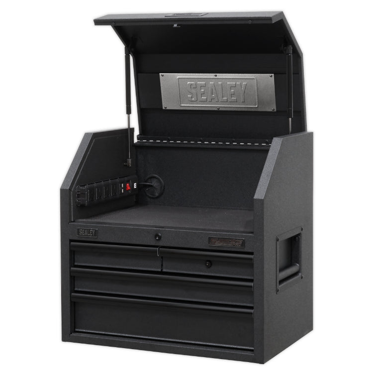 Clamshell style topchests feature robust side handles and are supplied, a power strip (4 x 230V, 2 x 5V 2.4A USB sockets) which can be installed on either side.